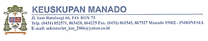 Sebagai Satu Gereja da!am keberagaman, Gereja Keuskupan Manado yang Sinodal dan Misioner, dipanggil dan diutus untuk berjalan bersama-sama dengan: Hirarki, Hidup Bakti dan Awam, Pemerintah, Umat Beragama dan Aliran Kepercayaan, Orang Miskin, Lanjut Usia dan Difabel. Pokok ini pulalah yang dalam kunjungan pastoral saya ke seluruh keuskupan yang sangat luas ini, saya selalu ingatkan dan tegaskan, sebagaimana yang sesungguhnya pernah diungkapkan oleh Paus Fransiskus, bahwa kita sebagai Satu Gereja, Satu Visi dan Misi, berada dalam satu kapal yang sama yaitu kapal Keuskupan Manado, sebagai Persekutuan Umat yang saling terhubung dan terikat. Kita berada bersama, bertayar berjelan bersama, bergerak bersama, diutus bersama, bergembira dan berharap berssma, sebagai Garem dan Terang dunis di mariapun kita berada.